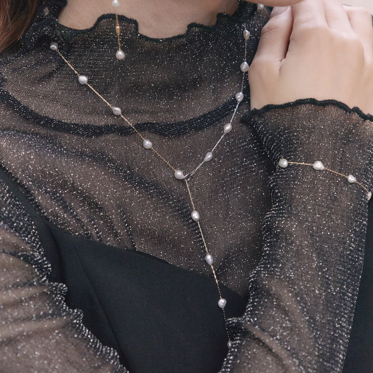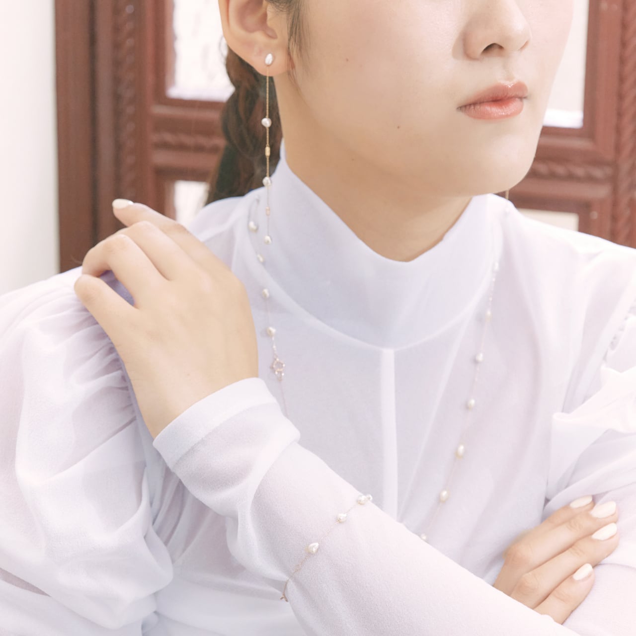 パールの艶めきが手元に寄り添い、装いに透明感をもたらします。