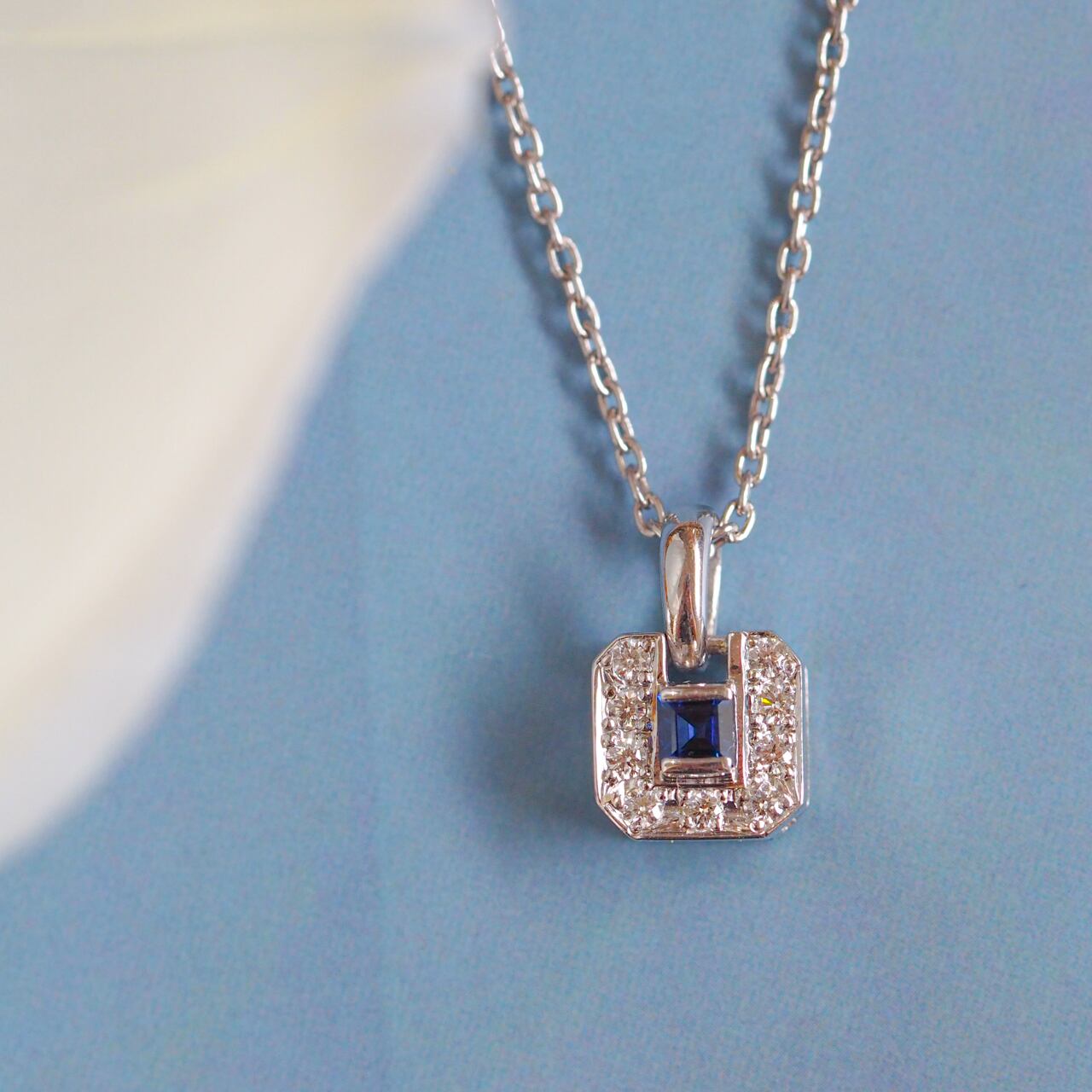 シンプルなデザインと、ダイヤモンドの中にサファイアがきらりと輝くペンダント